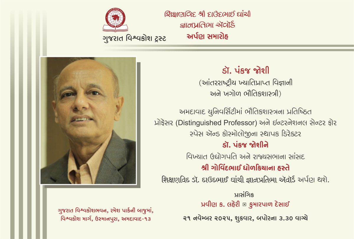 શ્રી ગોવિન્દભાઈ ધોળકિયાના હસ્તે શિક્ષણવિદ ડૉ. દાઉદભાઈ ઘાંચી જ્ઞાનપ્રતિભા ઍવૉર્ડ અર્પણ થશે.