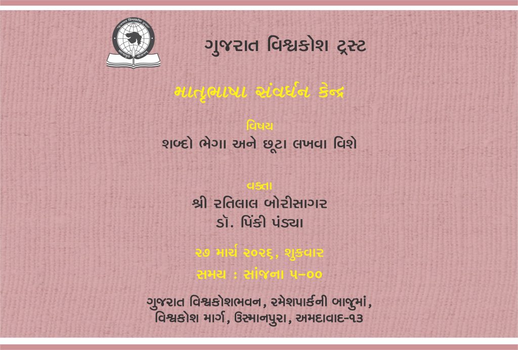 વિષય : શબ્દો ભેગા અને છૂટા લખવા વિશે વક્તા : શ્રી રતિલાલ બોરીસાગર – ડૉ. પિંકી પંડ્યા 27 માર્ચ, 2026, શુક્રવાર સાંજના 5-00