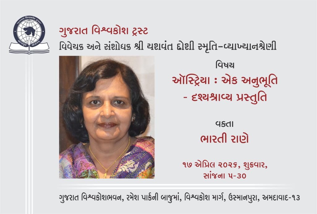 વિષય ઑસ્ટ્રિયા : એક અનુભૂતિ – દૃશ્યશ્રાવ્ય પ્રસ્તુતિ વક્તા : ભારતી રાણે 17 એપ્રિલ, 2026, શુક્રવાર સાંજના 5-30