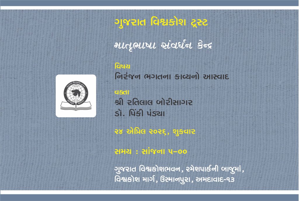 વિષય : નિરંજન ભગતના કાવ્યનો આસ્વાદ વક્તા : શ્રી રતિલાલ બોરીસાગર ડૉ. પિંકી પડ્યા 24 એપ્રિલ 2026, શુક્રવાર સાંજ 5-00