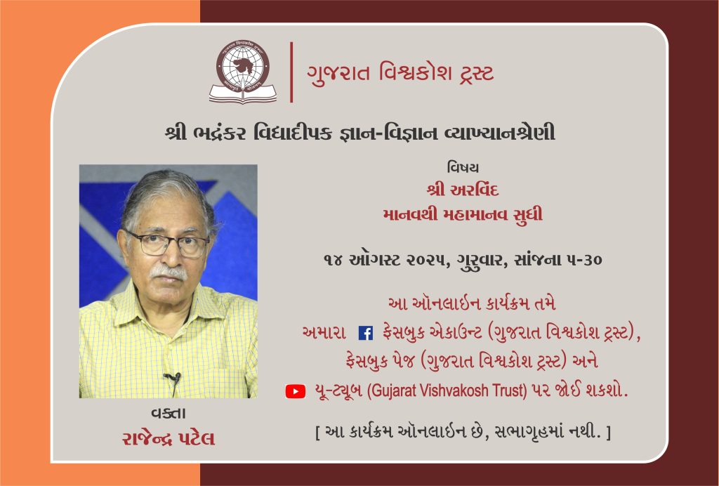 વિષય : શ્રી અરવિંદ માનવથી મહામાનવ સુધી | વક્તા : રાજેન્દ્ર પટેલ | 14 ઑગસ્ટ 2025, ગુરુવાર, સાંજના 5-30