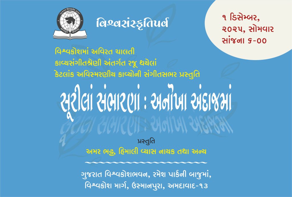 વિશ્વકોશમાં અવિરત ચાલતી કાવ્યસંગીતશ્રેણી અંતર્ગત રજૂ થયેલાં કેટલાંક અવિસ્મરણીય કાવ્યોની સંગીતસભર પ્રસ્તુતિ સૂરીલાં સંભારણાં : અનોખા અંદાજમાં | પ્રસ્તુતિ અમર ભટ્ટ, હિમાલી વ્યાસ નાયક તથા અન્ય 1 ડિસેમ્બર, 2025 સોમવાર સાંજના 6-00