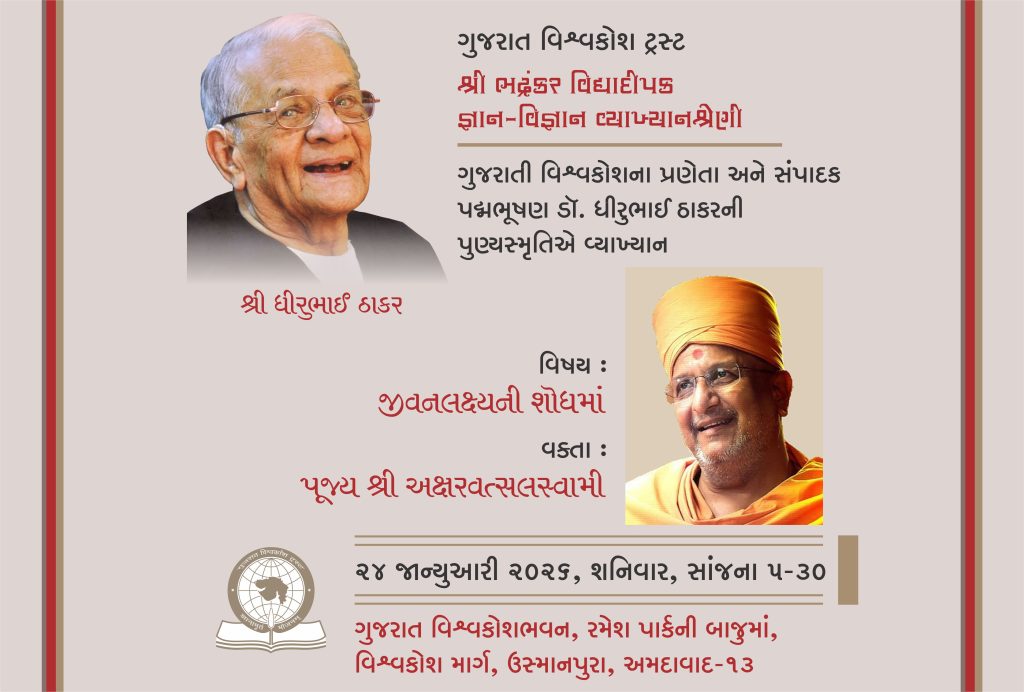 ગુજરાતી વિશ્વકોશના પ્રણેતા અને સંપાદક પદ્મભૂષણ ડૉ. ધીરુભાઈ ઠાકરની પુણ્યસ્મૃતિએ વ્યાખ્યાન વિષય : જીવનલક્ષ્યની શોધમાં | વક્તા : પૂજ્ય શ્રી અક્ષરત્સલસ્વામી 24 જાન્યુઆરી 2026 | શનિવાર, સાંજના 5-30