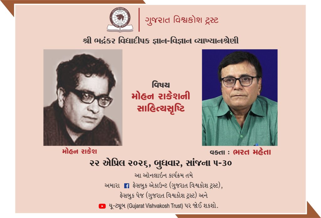 વિષય : મોહન રાકેશની સાહિત્યસૃષ્ટિ વક્તા : ભરત મહેતા 22 એપ્રિલ 2026, બુધવાર સાંજ 5-30