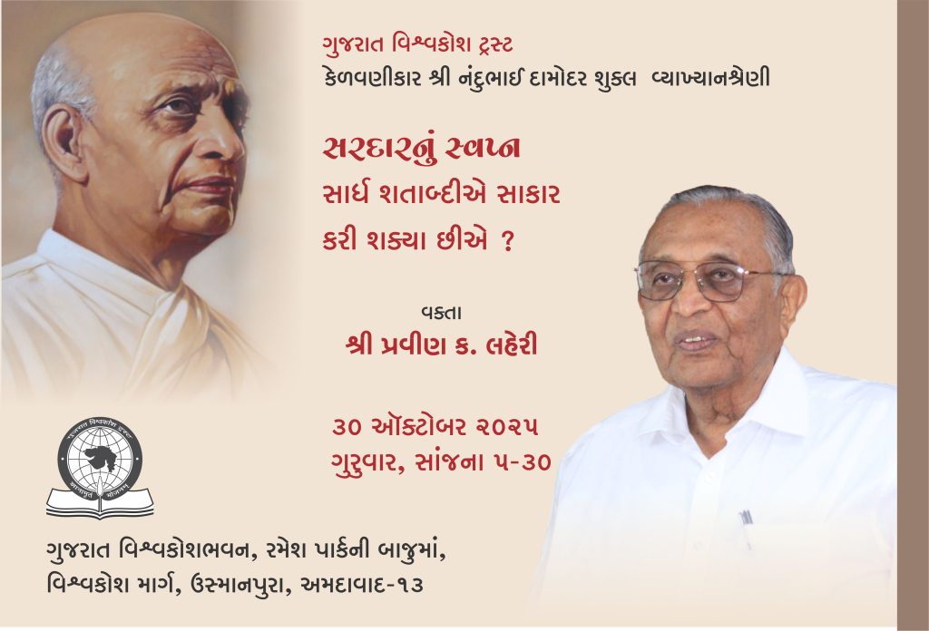 સરદારનું સ્વપ્ન સાર્ધ શતાબ્દીએ સાકાર કરી શક્યા છીએ ? વક્તા : શ્રી પ્રવીણ ક. લહેરી | 30 ઑક્ટોબર 2025, ગુરુવાર, સાંજના 5-30