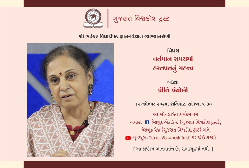 વિષય : વર્તમાન સમયમાં હસ્તપ્રતનું મહત્ત્વ | વક્તા : પ્રીતિ પંચોલી | 15 નવેમ્બર 2025, શનિવાર, સાંજના 5-30