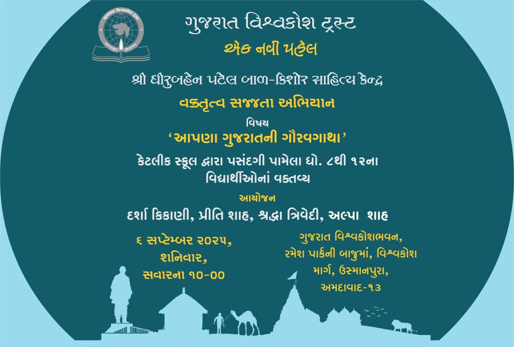 શ્રી ધીરુબહેન પટેલ બાળ-કિશોર સાહિત્ય કેન્દ્ર વક્તૃત્વ સજ્જતા અભિયાન | વિષય : ‘આપણા ગુજરાતની ગૌરવગાથા’ કેટલીક સ્કૂલ દ્વારા પસંદગી પામેલા ધો.8થી 12ના વિદ્યાર્થીઓનાં વક્તવ્ય આયોજન – દર્શા કિકાણી, પ્રીતિ શાહ, શ્રદ્ધા ત્રિવેદી, અલ્પા શાહ | 6 સપ્ટેમ્બર 2025, શનિવાર, સવારના 10-00
