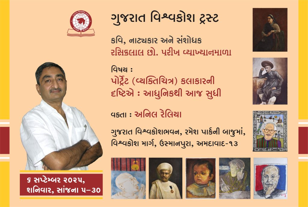 રસિકલાલ છો. પરીખ વ્યાખ્યાનમાળા વિષય : પોર્ટ્રેટ (વ્યક્તિચિત્ર) કલાકારની દૃષ્ટિએ : આધુનિકથી આજ સુધી | વક્તા : અનિલ રેલિયા | શનિવાર, સાંજના 5-30 |